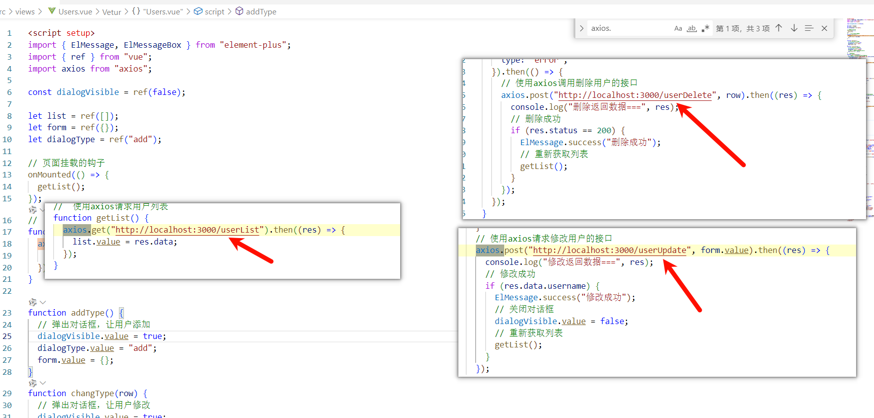 我们到这里其实功能已经全部实现了,但是有个问题,我们调用axios的地方比较分散,也比较多。假如有一天我们正式发布上线了,或者后台开发改了接口地址,我们是不是要一个个去修改。一个个去修改是不是很繁琐,还容易犯错。