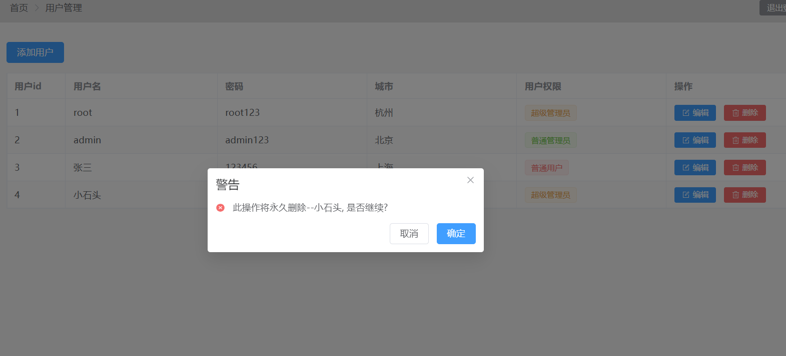删除用户前,需要给用户二次确认弹窗,防止用户误删除。