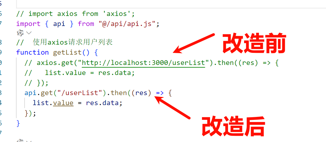 其实写法上,就是提取了一个接口地址到api.js里方便我们后面修改。其他的地方基本没有变化。