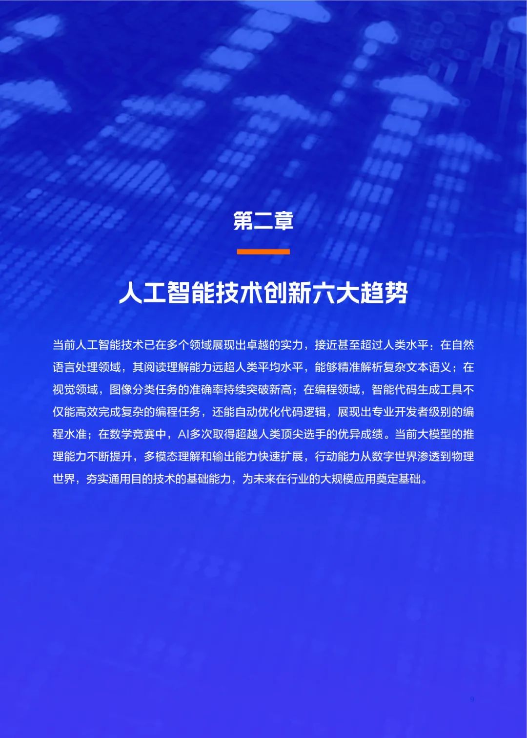 2025年,是全球人工智能应用加速落地的一年。围绕“人工智能+”国家重要战略,阿里云研究院联合中央广播电视总台视听新媒体中心、总台研究院、总台技术局,基于AI 行业应用的广泛调研和对《赢在AI 》参赛企业的深度观察,结合专家访谈和1500余份问卷调查,系统地总结了当前中国人工智能技术发展和应用现状。报告提出人工智能的“654”体系,即六大技术创新趋势、五新应用落地场景和产业智能化四力评估,通过全景