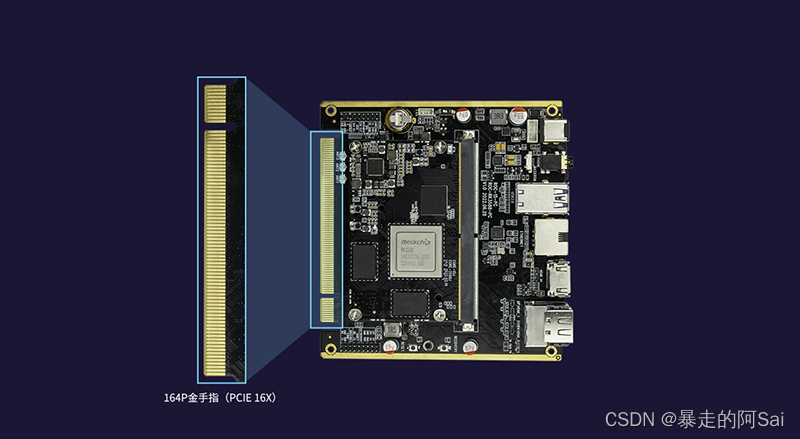 标准164P金手指(PCIE 16X)多种功能扩展接口,开放引脚定义(包括:5G/4G LTE接口、千兆以太网、MIPI-CSI、MIPI-DSI、VGA、DP1.4、USB3.0、I2C、PCIe2.0、UART、PWM、CAN、I2C、SPDIF),可扩展自主底板、堆叠集群等高级功能。