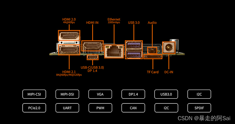 主板拥有HDMI2.1、HDMI2.0、HDMI-IN、USB-C(USB3.0、DP1.4)、千兆以太网、USB3.0、PH2.0排针(UART、ADC、Debug、SPI、I2C、LINE OUT)等接口。