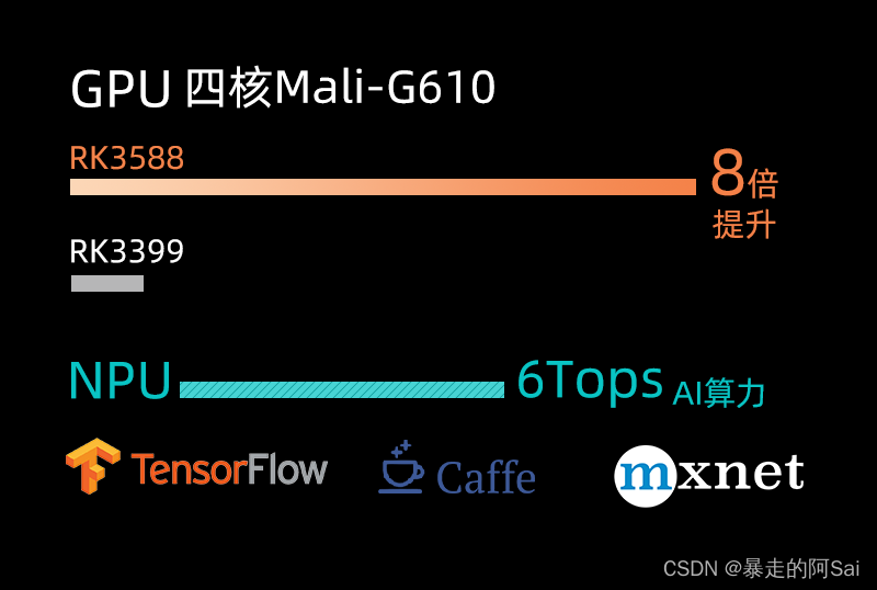 集成ARM Mali-G610 MP4四核GPU,支持 OpenGL ES3.2 / OpenCL 2.2 / Vulkan1.1, 450 GFLOPS;内置高达 6TOPS 算力的AI加速器NPU,支持INT4/INT8/INT16混合运算,可实现基于TensorFlow / MXNet / PyTorch / Caffe等一系列框架的网络模型轻松转换。