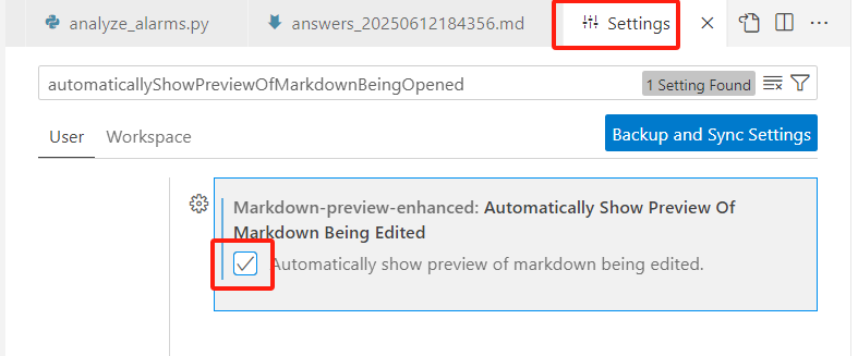 在搜索框中输入 markdown-preview-enhanced.automaticallyShowPreviewOfMarkdownBeingOpened。