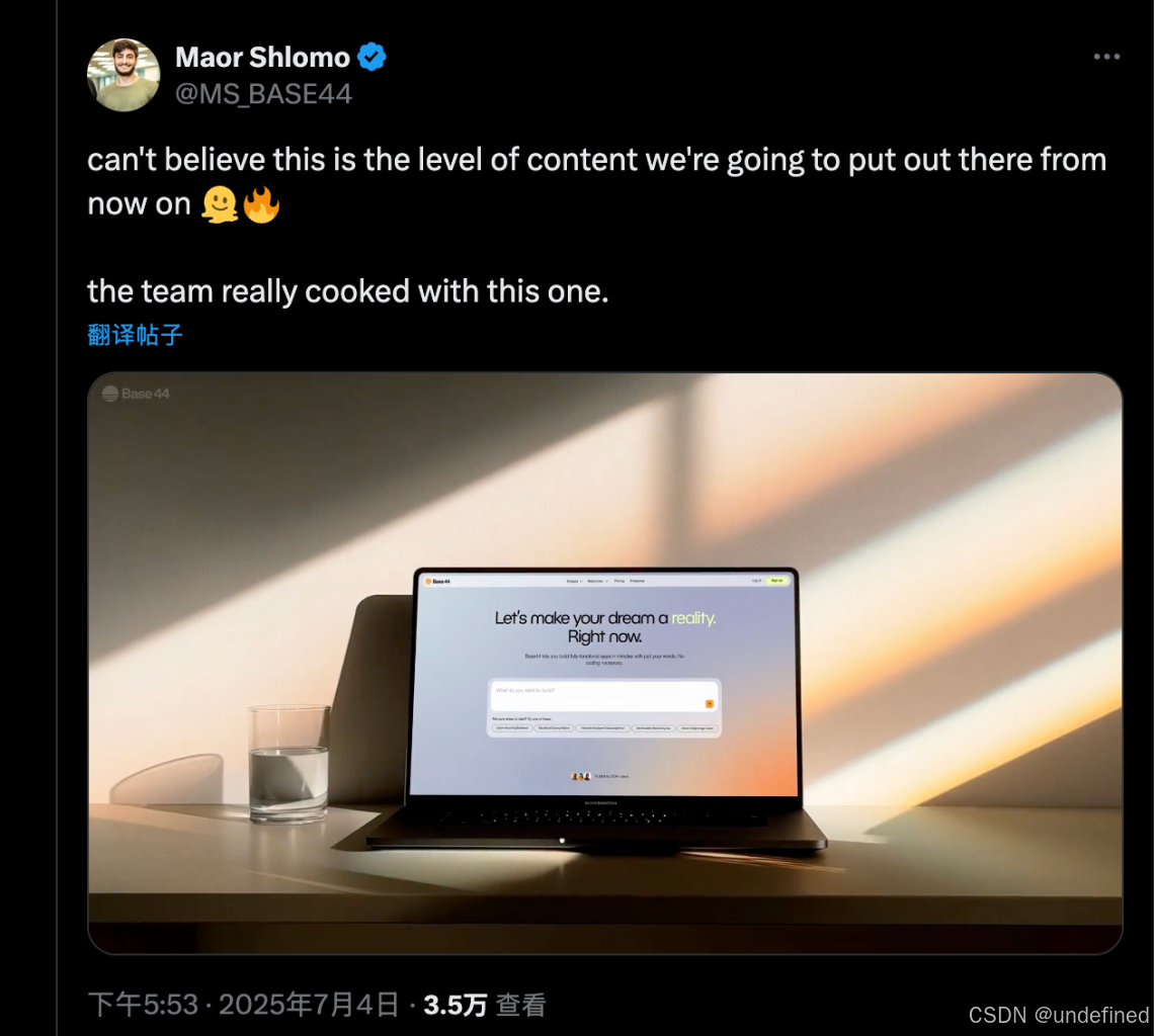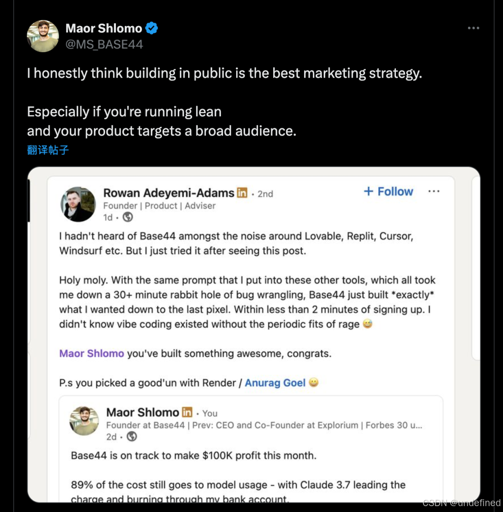 但他并没有一开始就埋头苦干,而是先发了一条推特,向世界宣告我要搭建这个产品,并且以后我会把所有的开发过程都公开,邀请大家一起见证 base44 的成长。