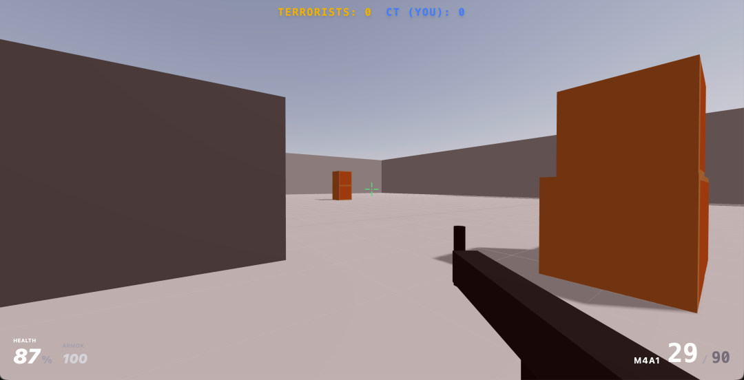 再让AI帮我丰富一下提示词,它做出来了一个枪战demo,画面风格很像UE的模板场景,碰撞、射击、跳跃等功能均正常。