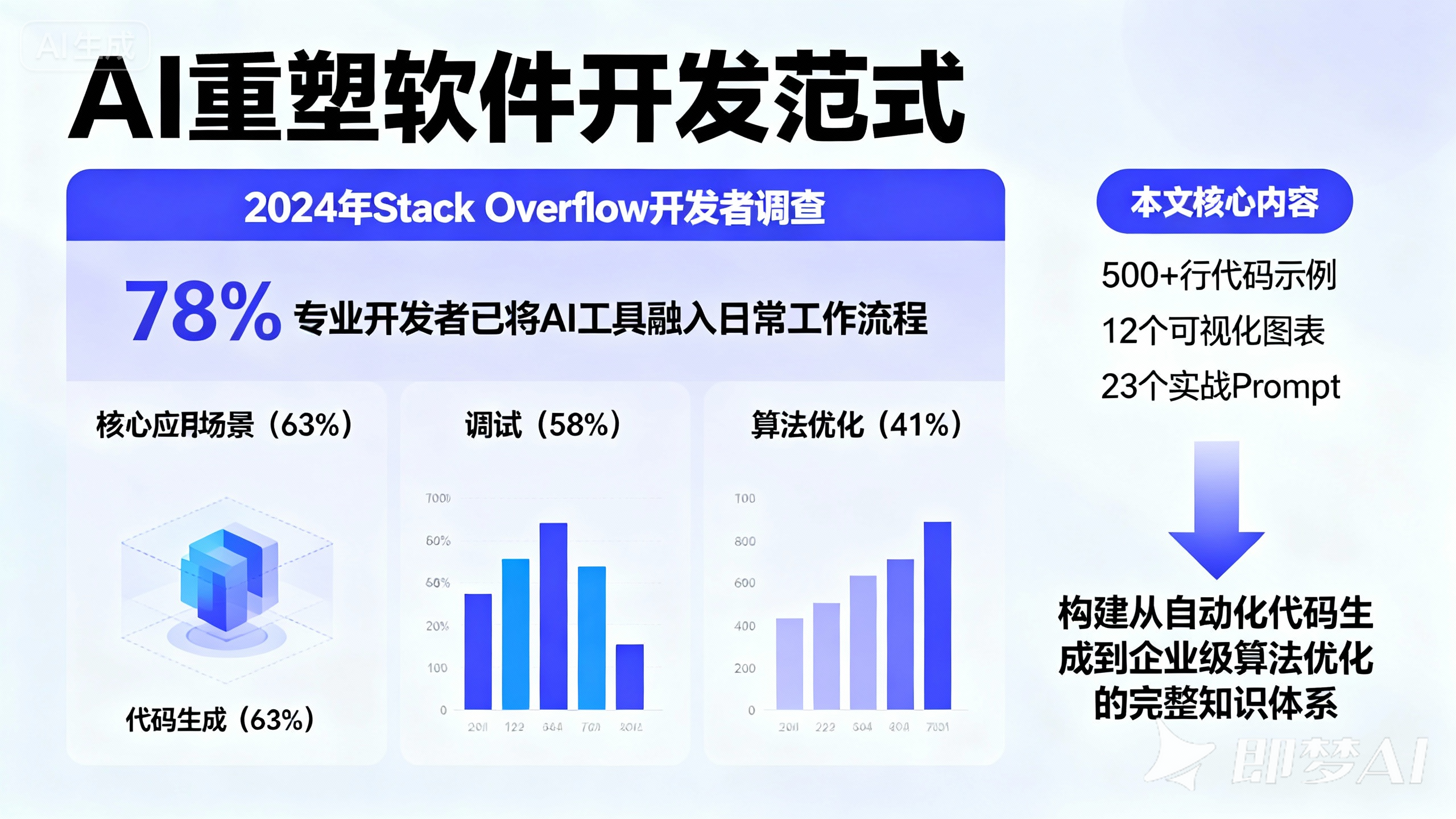 AI正以前所未有的速度重塑软件开发范式。2024年Stack Overflow开发者调查显示,78%的专业开发者已将AI工具融入日常工作流程,其中代码生成(63%)、调试(58%)和算法优化(41%)成为三大核心应用场景。本文将系统拆解AI编程的技术栈与实践路径,通过500+行代码示例、12个可视化图表和23个实战Prompt,构建从自动化代码生成到企业级算法优化的完整知识体系。