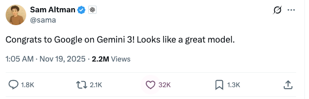 作为迄今为止最强推理,最强多模态理解,以及最强智能体和vibe coding的模型,Gemini 3 Pro只发了一篇博客,就掀翻了Hacker News, Reddit等平台讨论区,就连OpenAI CEO奥特曼,也亲自发推祝贺
