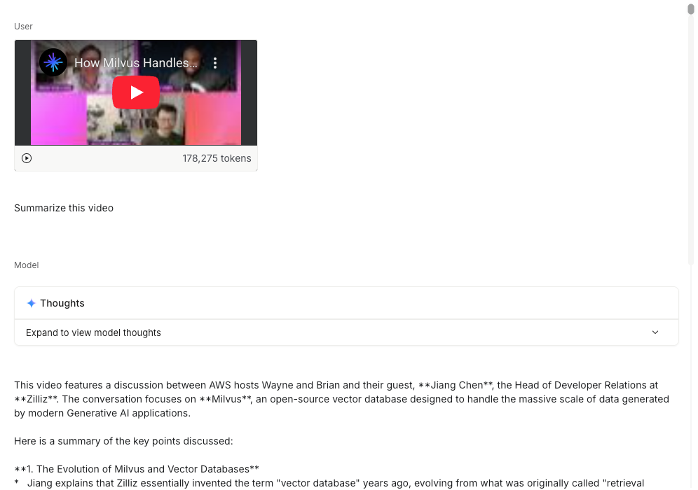 我们上传一个Zilliz在Youtube的视频,它能够在40秒左右完成阅读和理解,速度惊人