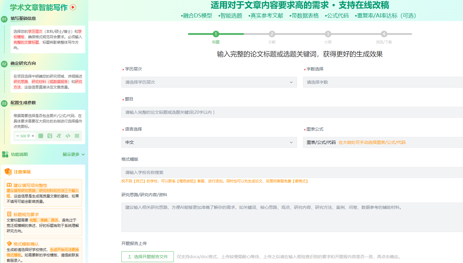 学历层次:务必选择**“本科”**。系统会自动调整语言的学术深度,避免生成过于晦涩难懂或过于简单的内容。