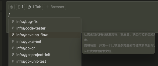 其中配置了必要的Tools和Prompts,比如 需求文件获取、合并请求创建等Tools, develop-flow、code-review、unit-test等Prompts. 可以在聊天窗口通过/快速触发。
