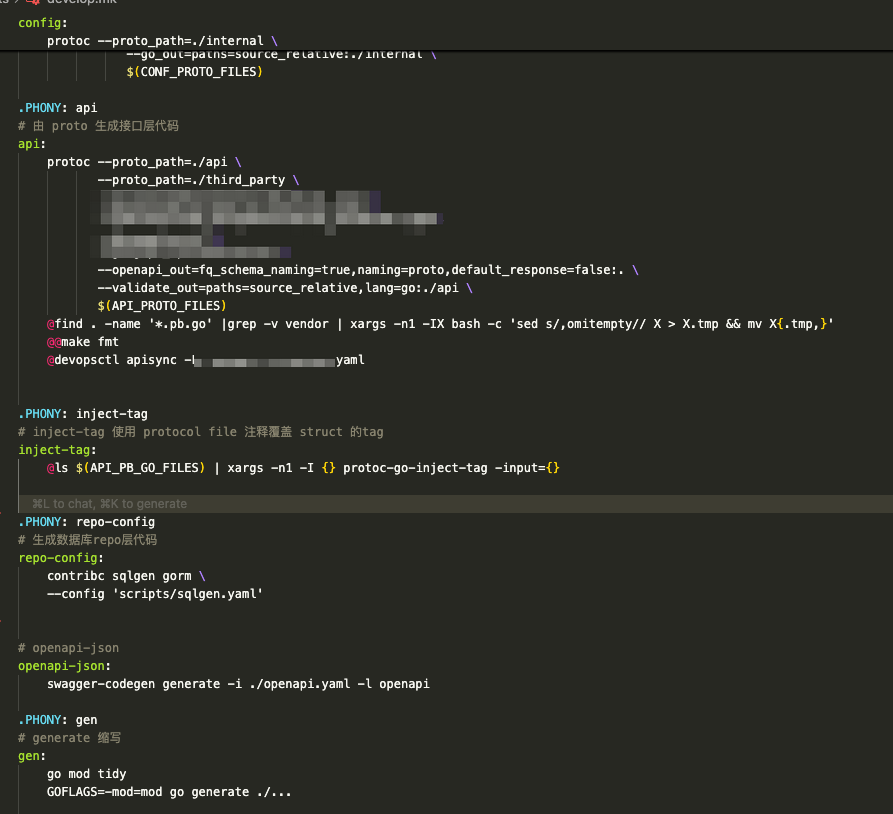 我们将代码生成工具,通过 Makeflie 的形式提供,比如 api生成、repo层代码生成、错误码生成…: