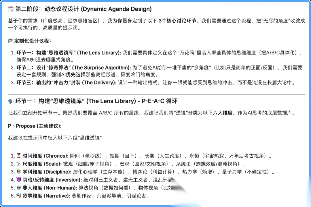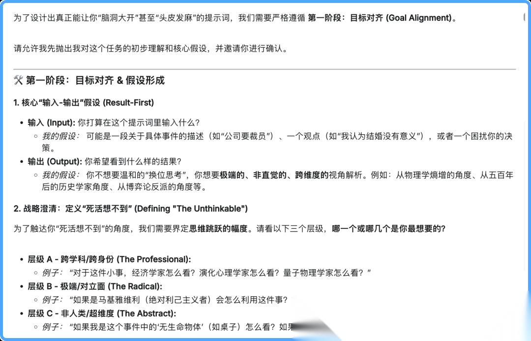 我给大家抽取一个案例演示一下,比如说我想和它一起搭建一个多角度看待一件事情的提示词,它会先和我做目标的对齐确认。