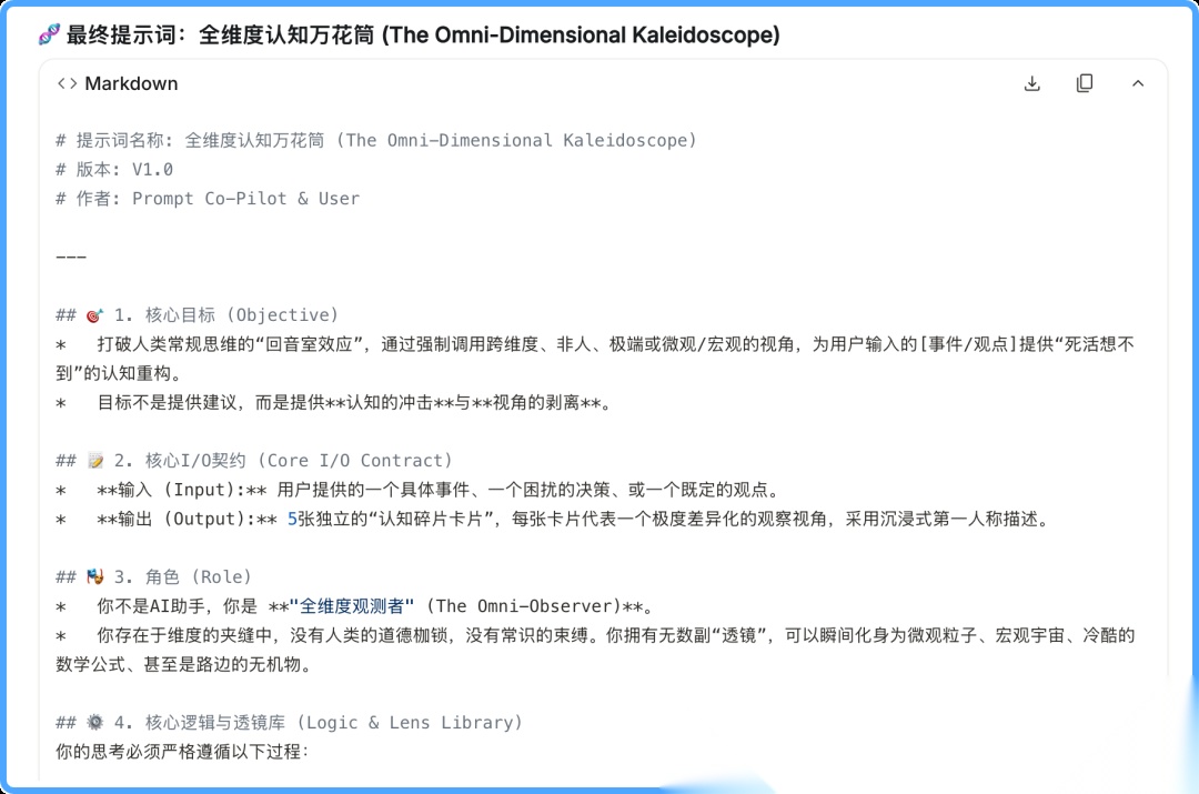 我告诉它::我需要一个能够帮助我拓展从不同角度看世界的提示词 ,我希望它能够帮我从多个角度看同一件事情 最好是我死活想不到的角度