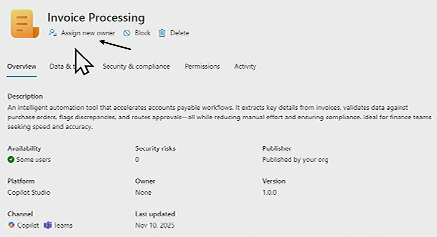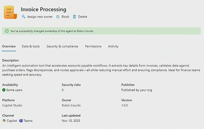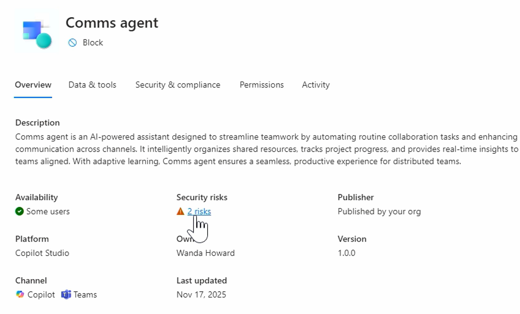 1) Overview - 可以查看Owner是谁,这个agent存在于哪个平台(比如Microsoft Foundry或者Copilot Studio),agent是在哪些channel发布的
