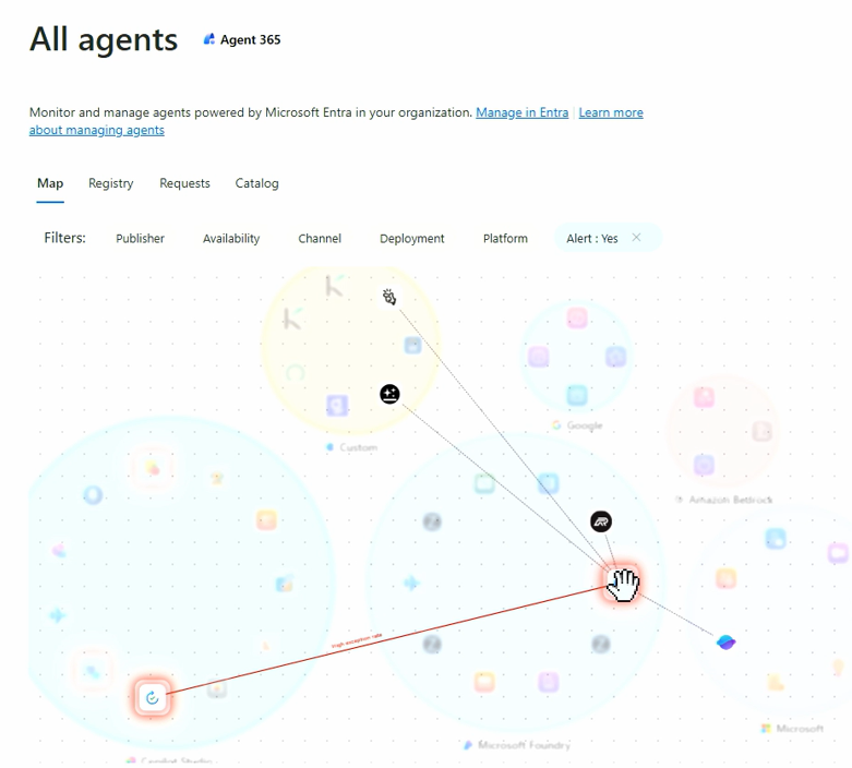 打开agent 365 管理门户,点击 Map,点击某个agent可以看到特定agent与哪些agent存在interactions关系。Manus也在会上简短演示了这个feature。