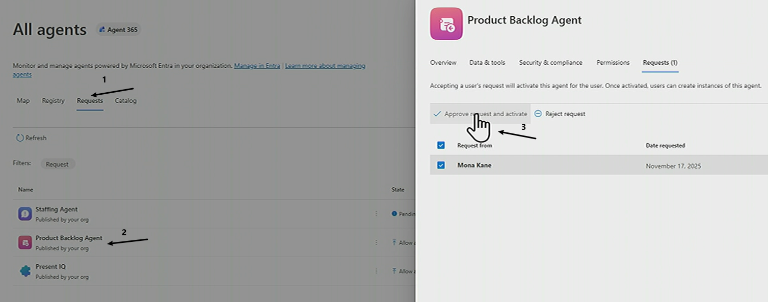 1) 点击Requests tab,选中特定agent,点击Approve request and activate按钮,