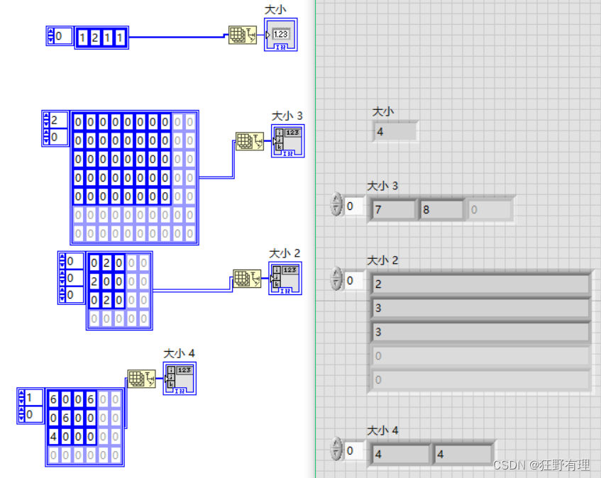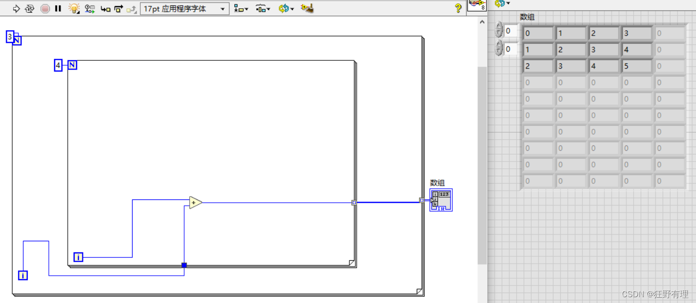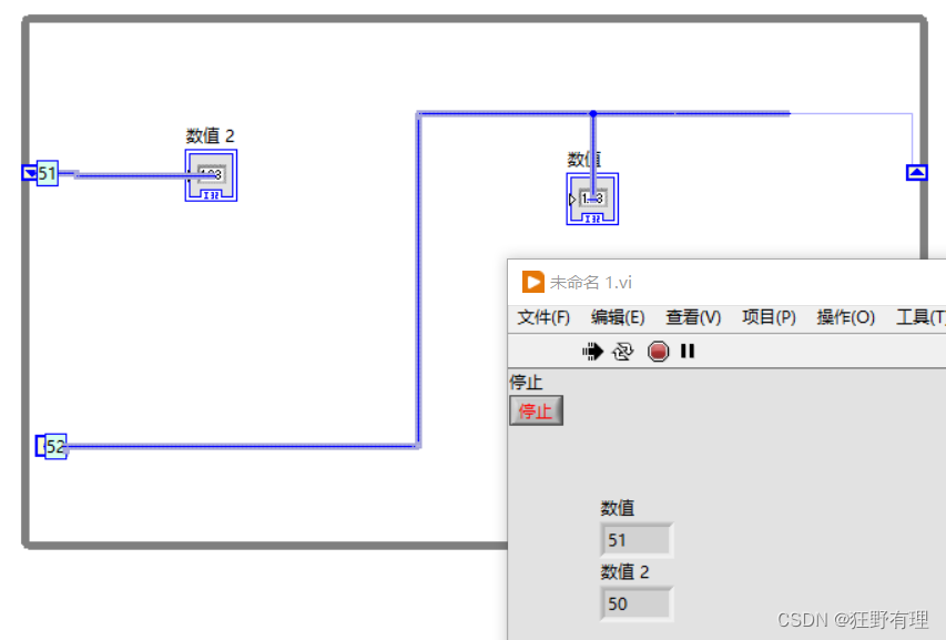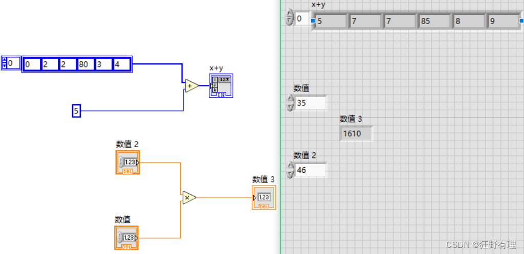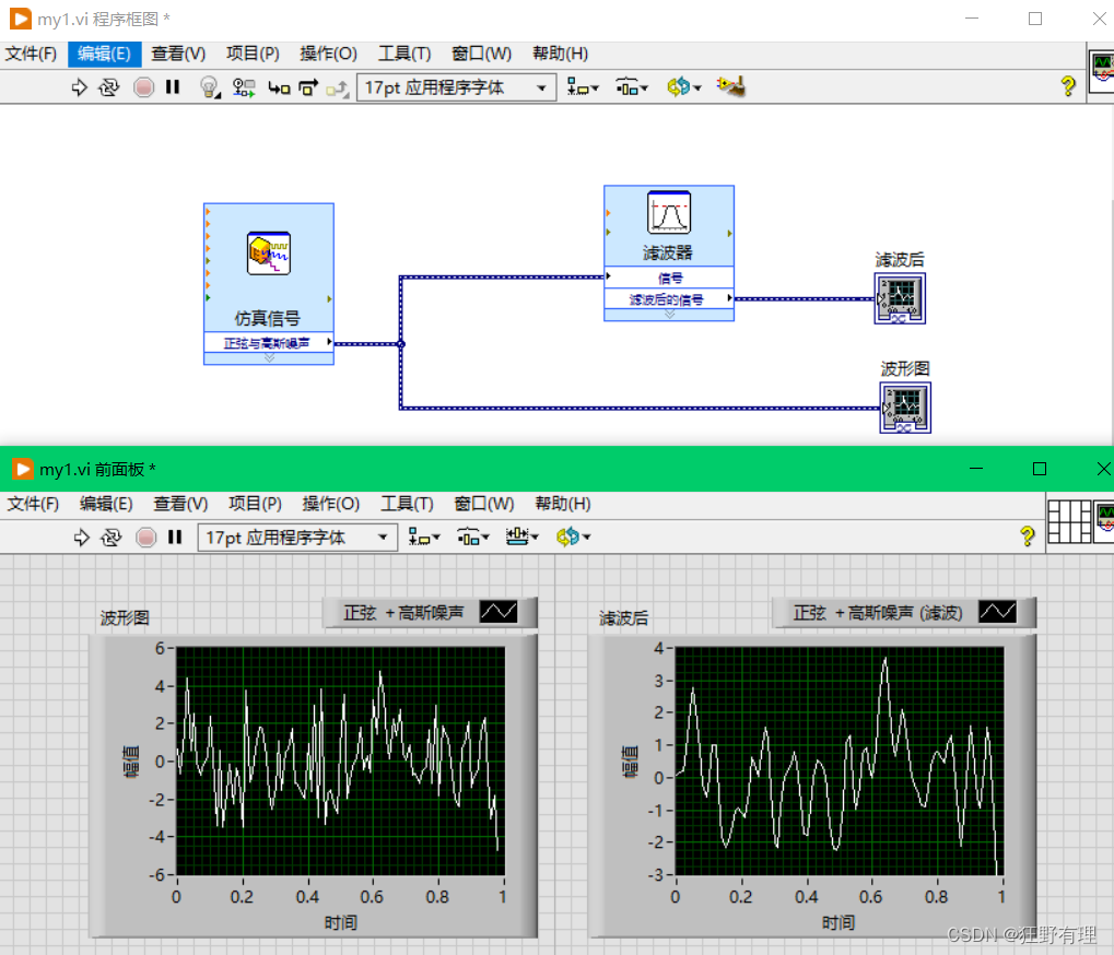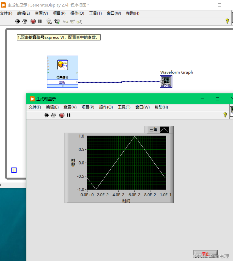 - 程序框图(Block Diagram):用于编写程序代码,使用图形化的编程方式连接不同的函数和模块。