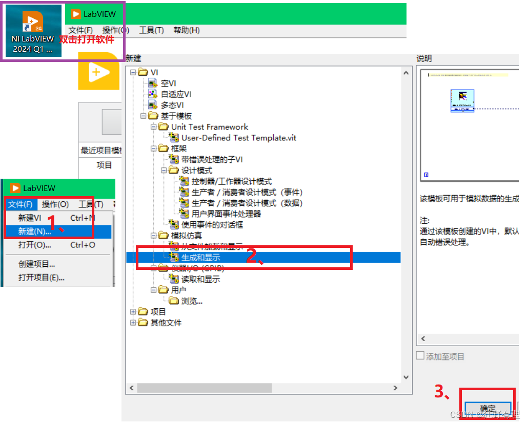 - 启动 LabVIEW 后,点击 "File" 菜单,选择 "New VI" 创建一个新的虚拟仪器。