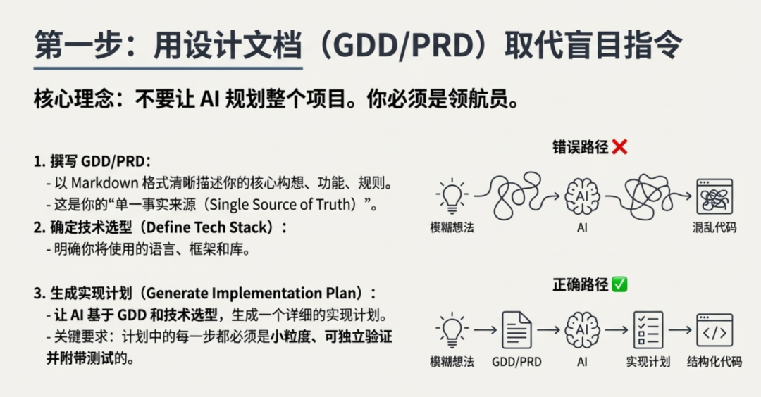 最开始要做一个 Game Design Document(GDD,或者如果是应用的话,就是产品需求文档 PRD),以 Markdown 格式写清你的构想。