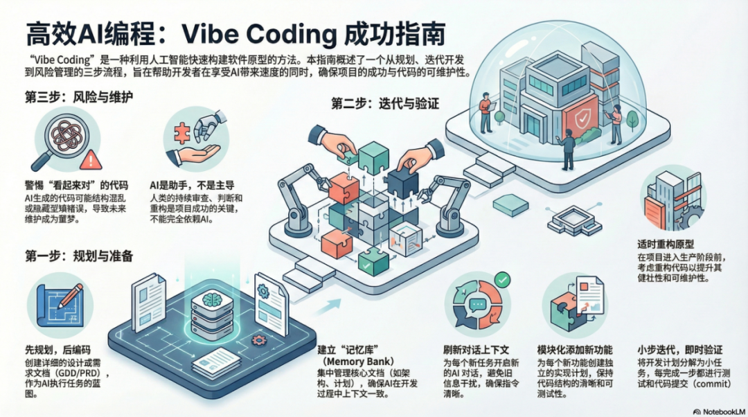 Vibe Coding是利用AI大模型辅助编程的方法论,强调先做好项目规划(GDD/PRD)和实现计划,通过Memory Bank维持上下文一致性,采用小步迭代+验证+提交的开发模式。该方法可快速原型验证,但需注意AI生成代码可能存在结构混乱和隐藏bug的风险,建议结合传统软件工程流程,保持测试习惯和适度审查,平衡开发效率与代码质量。