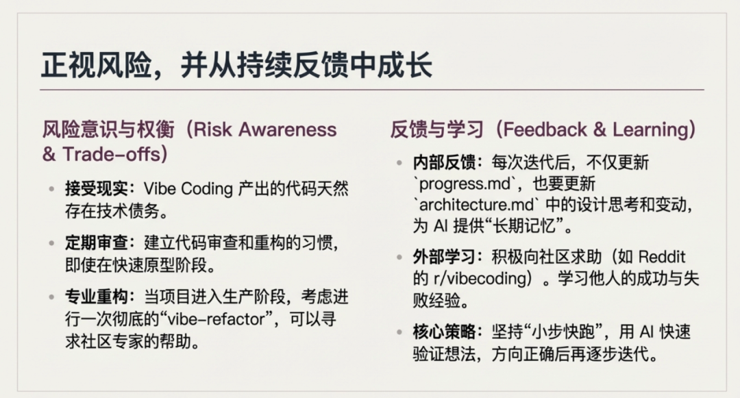 4)保持适度的审查机制:虽然是 vibe coding,但定期审查代码、做重构、建立测试习惯非常重要。