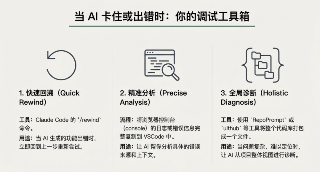 1)如果 AI 生成功能出错,用 Claude Code 的 /rewind 回到上一步重新尝试。