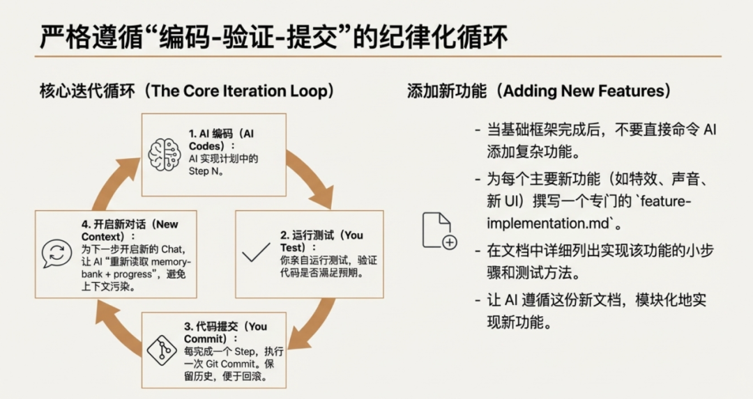 1)在基础框架(base game / app)完成后,想加新功能(特效、声音、UI …)时,不要直接命令 AI 写代码,而是为每个大功能写一个 feature-implementation.md:列出小步骤 +测试。