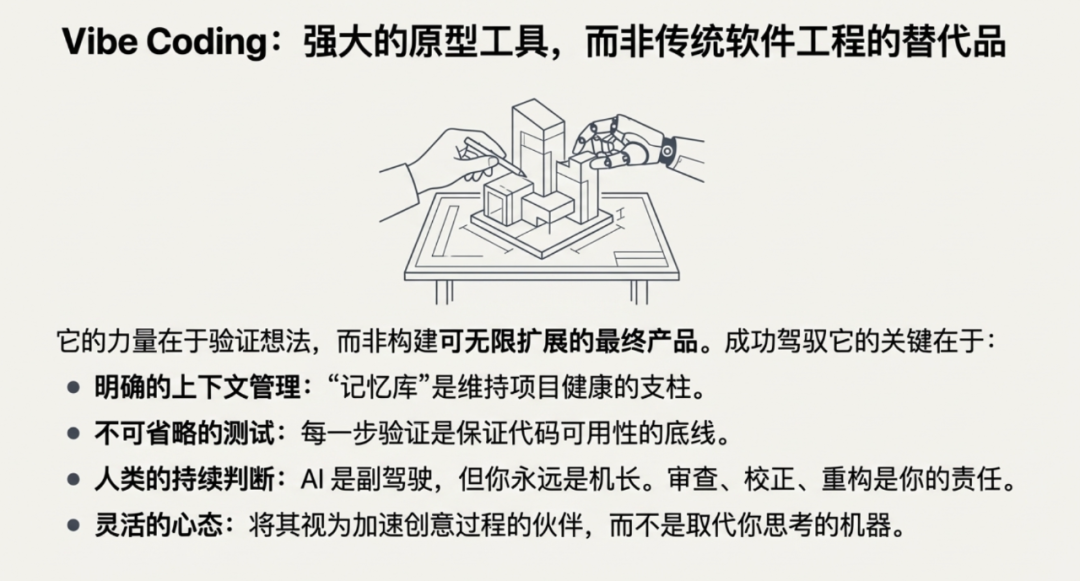 1)vibe coding 是一个强大的快速原型工具:它可以让你很迅速地把想法验证出来。但它不应该取代所有传统的软件工程流程,尤其是当你追求长期维护或扩大规模时。