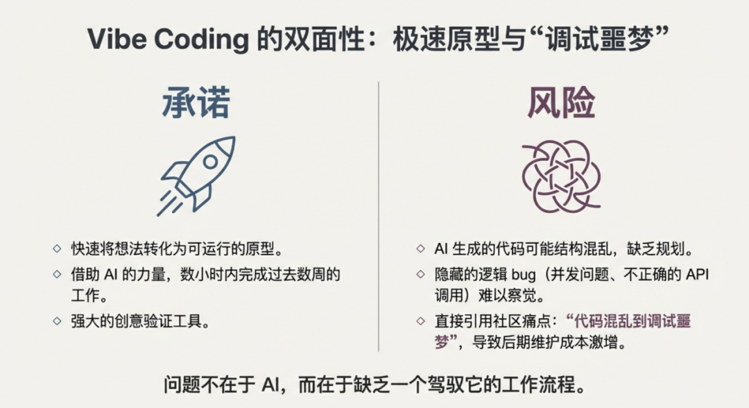 1)虽然 vibe coding 鼓励快速产出,但这种方式有潜在风险:AI 写出的代码可能结构混乱、未来维护困难。社区里有人提到 “代码混乱到调试噩梦”。