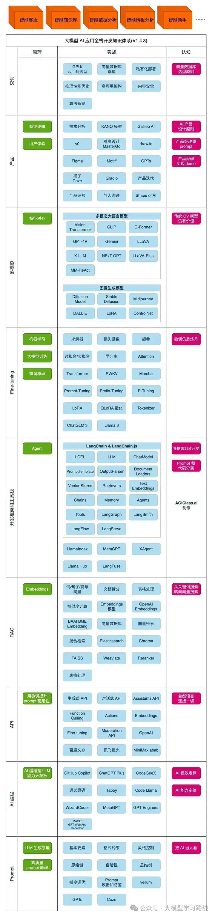 我们把这个路径捋一下,就得到了这张AI大模型全栈知识地图: