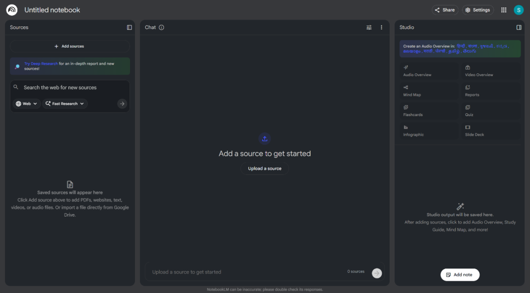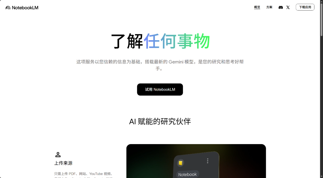 上传 PDF、文档、书籍内容,NotebookLM 会: