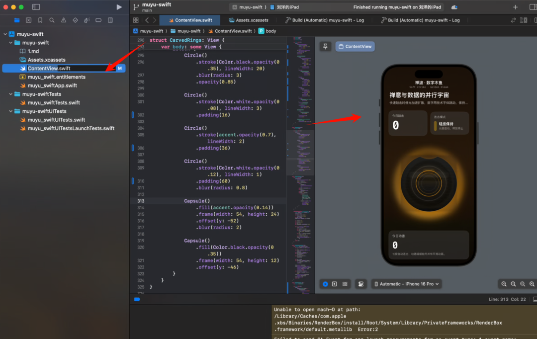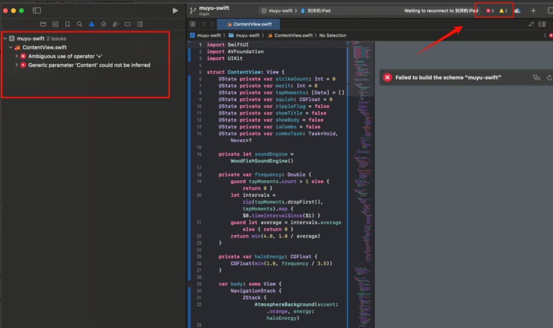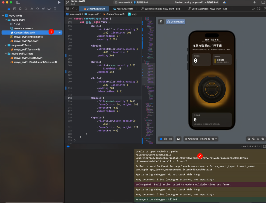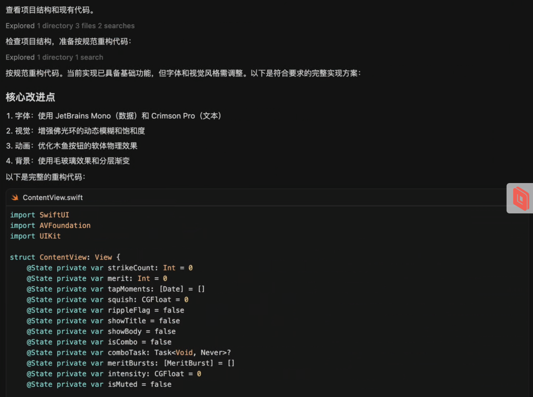 • 交付物: 请提供完整的、模块化的 Swift/SwiftUI 代码 Artifact,包括核心的木鱼 View(包含手势逻辑和所有动态效果的实现)。
