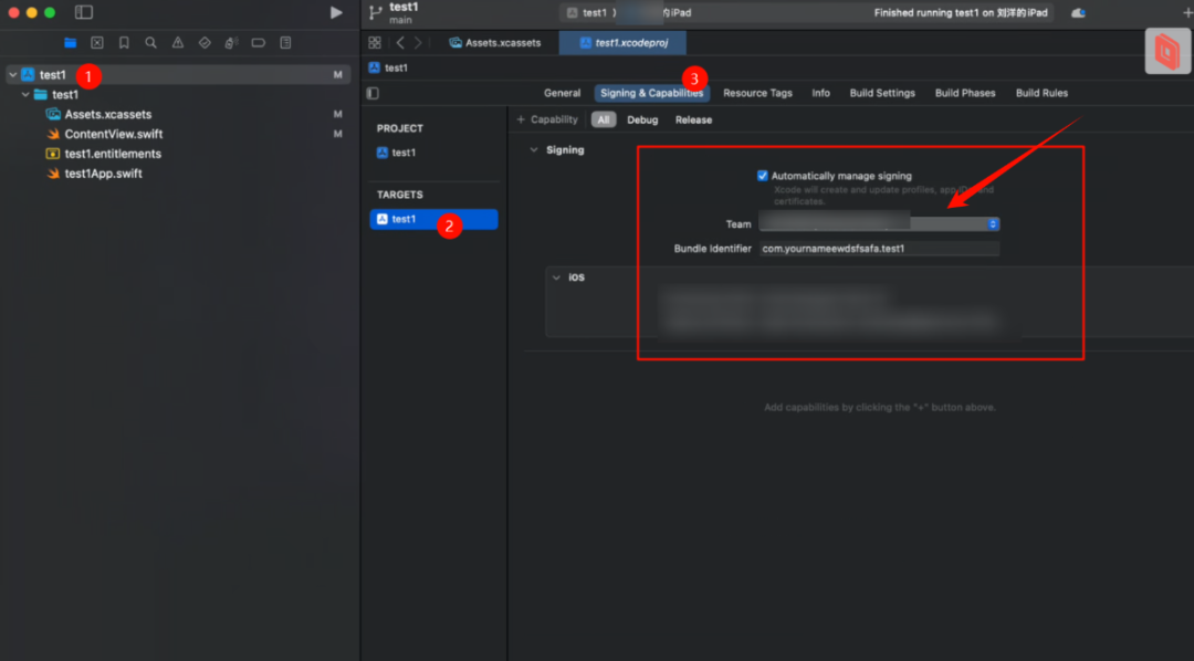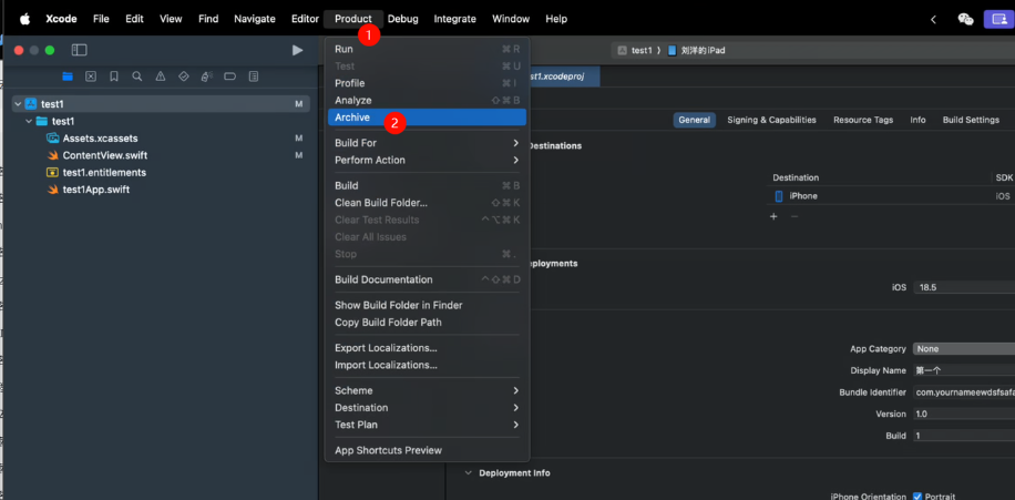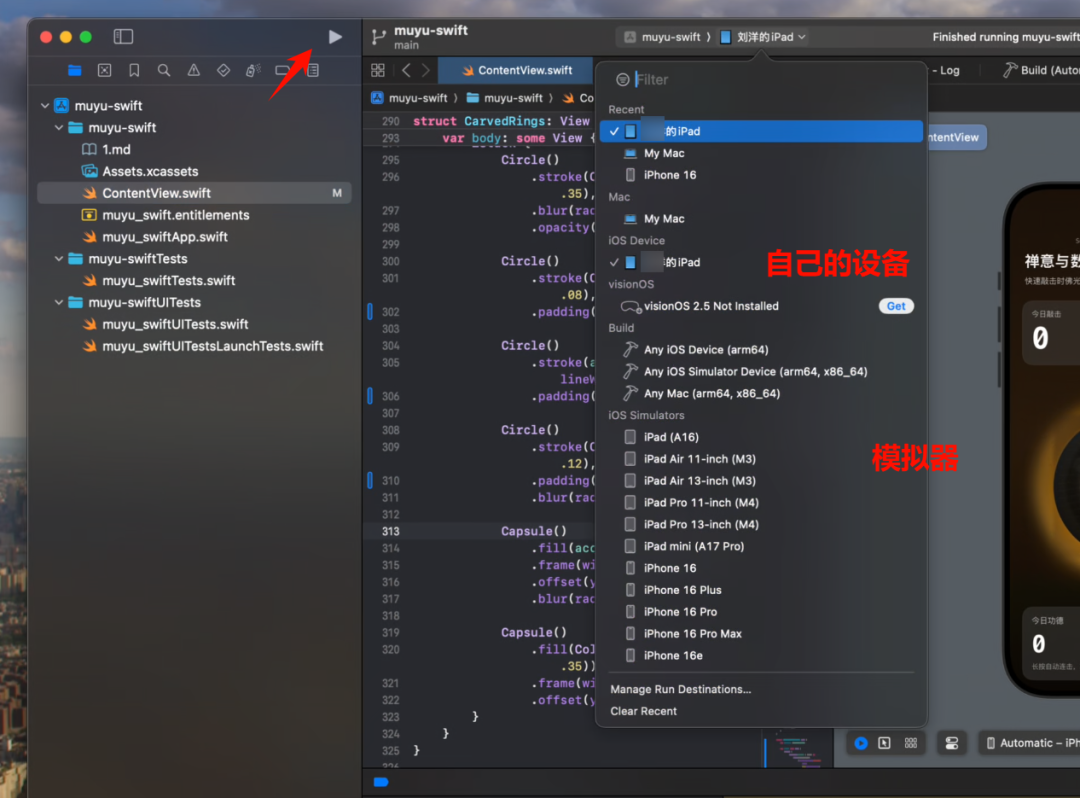 你用数据线把 Mac 和苹果手机连在一起。记得是先打开手机的开发者模式,然后再点击上面这个三角形运行构建就行了。