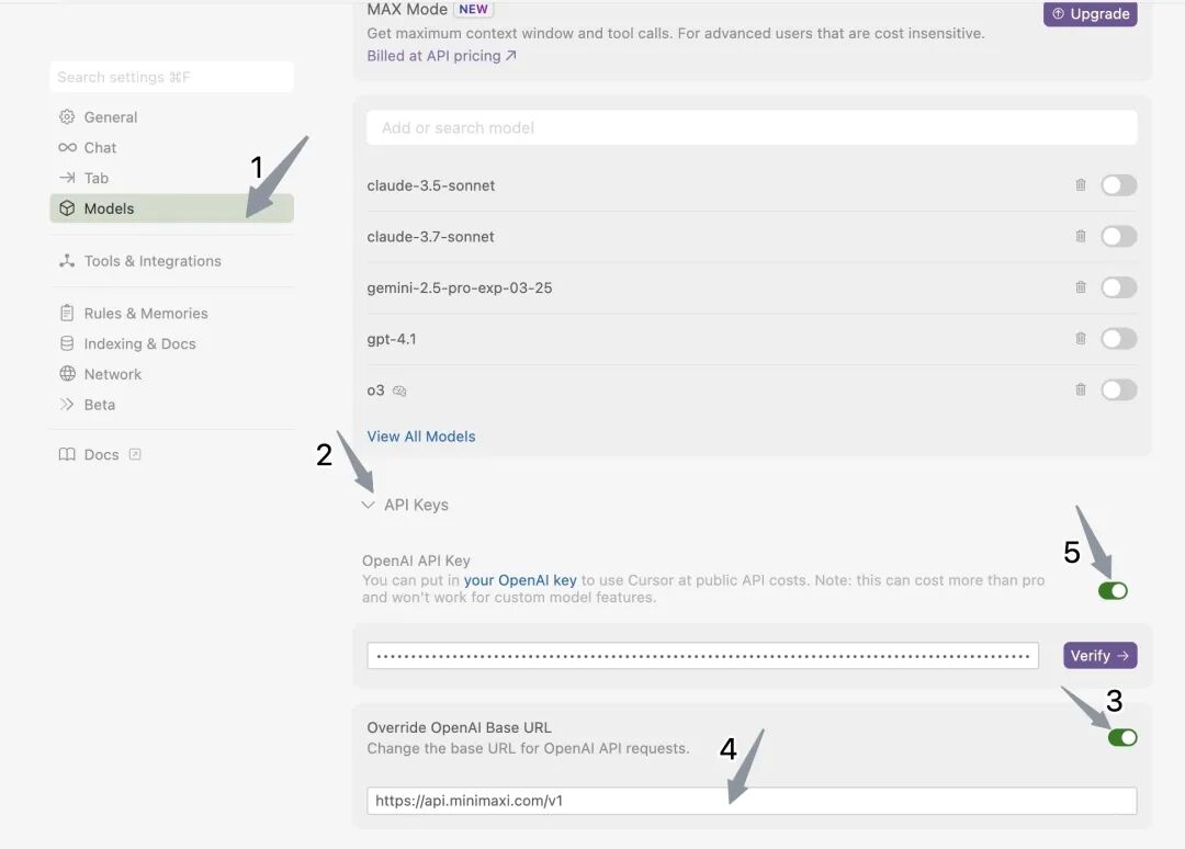 接着,打开cursor,按照图示选择,点击 “OpenAI API Key” 栏右侧的按钮