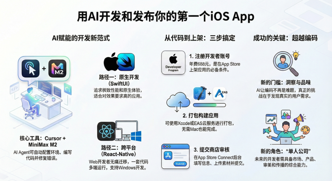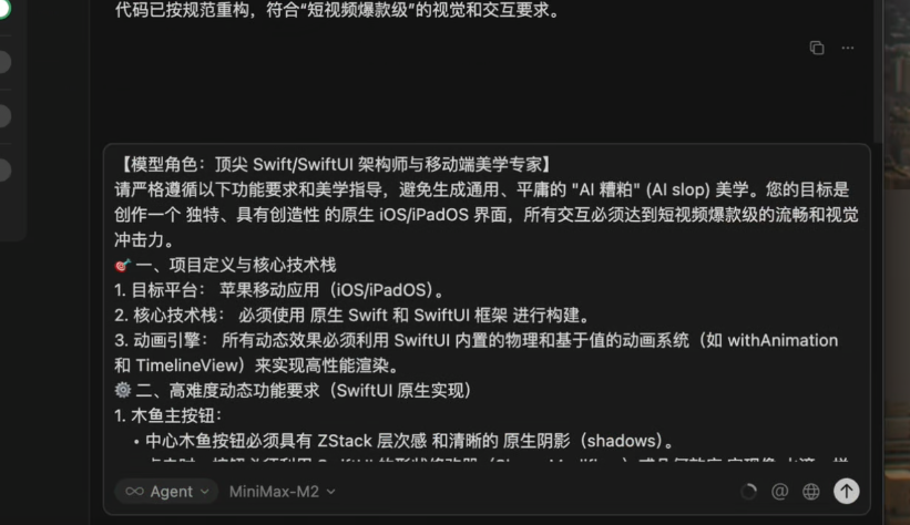 本文介绍了如何利用AI工具从零开始开发iOS应用程序。文章详细讲解了使用Xcode结合AI编程工具Cursor和MiniMax M2的开发流程,包括项目创建、AI编码接入和具体功能实现。重点演示了开发"数字木鱼"App的过程,提供了详细的SwiftUI开发提示词,强调原生动画效果、美学设计和反趋同性原则。同时文章还提及了Windows开发、云打包、支付接入和App发布等全流程注
