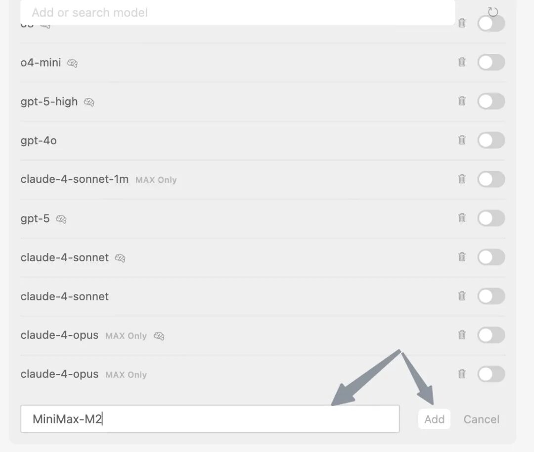 按钮,输入模型名称“MiniMax-M2”后,点击“Add”按钮