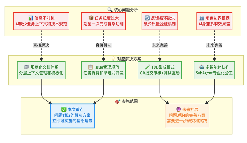 基于上述四个核心问题的分析,我们需要针对性地设计解决方案。通过建立规范化的协作流程,系统性地解决AI编程采纳率不高的问题。