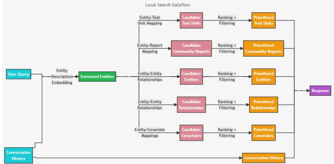 从知识图谱中识别出一组与用户输入在语义上相关的实体。这些实体可作为知识图谱的访问点,从而提取更多相关详细信息,例如连接实体、关系、实体协变量和社区报告。此外,它还会从与已识别实体相关的原始输入文档中提取相关文本块。然后对这些候选数据源进行优先排序和筛选,以适应预定义大小的单个上下文窗口,该窗口用于生成对用户查询的响应。