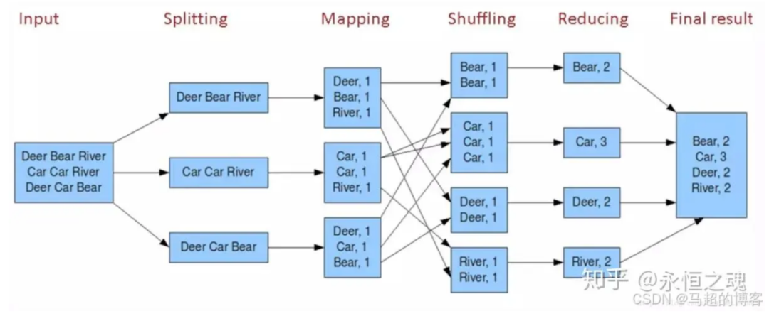 - Reduce 过程,把 key 值相同 value 值累加,得到新的<key,value>对,并作为 word count 的输出结果。(组内综合打分后排序过滤 0 分的结果,然后由 LLM 生成回复)