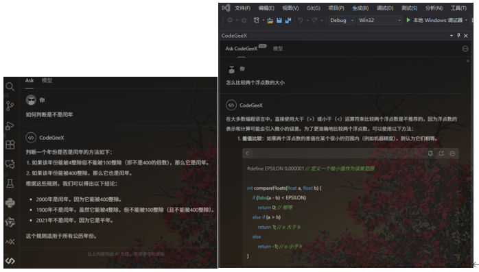 (3)在模型的问答栏可以交互,同时在VSCode/VisualStudio的工作区也可以使用“代码自动生成和补全”(通过注释生成相应的代码)、“代码翻译”、“自动添加注释”等功能。
