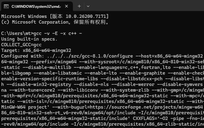 将解压后的目录中的bin 文件夹路径(D:\ProgramFiles\Mingw64\bin)添加到系统变量的Path路径下。验证一下环境是否配置好,打开 cmd 或者 PowerShell ,输入:g++ --version 或 gcc -v -E -x c++ - 来查看,出现如下所示版本信息即可。