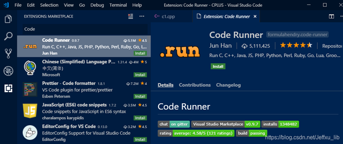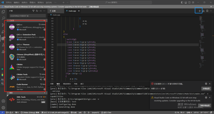 这个Code Runner可以让你直接运行C++文件,安装好之后点右上角蓝色方框的三角符号就可以运行了。