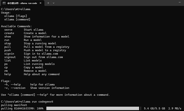 (5)打开一个新的终端,在终端输入:ollama run codegeex4