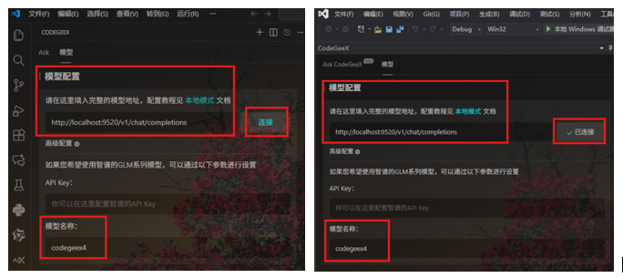 (2)在VSCode/VisualStudio里配置模型链接,点击连接