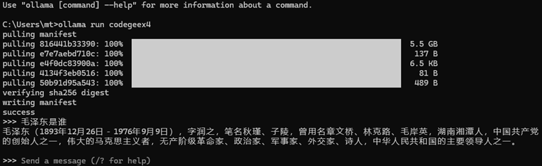 在Ollama官网 https://ollama.com/download/windows,搜索codegeex4,复制ollama run codegeex4 命令,在终端运行 ollama run codegeex4 命令,就开始安装CodeGeeX4-ALL-9B模型了。看到终端命令行提示”Send a message”表示模型安装成功。