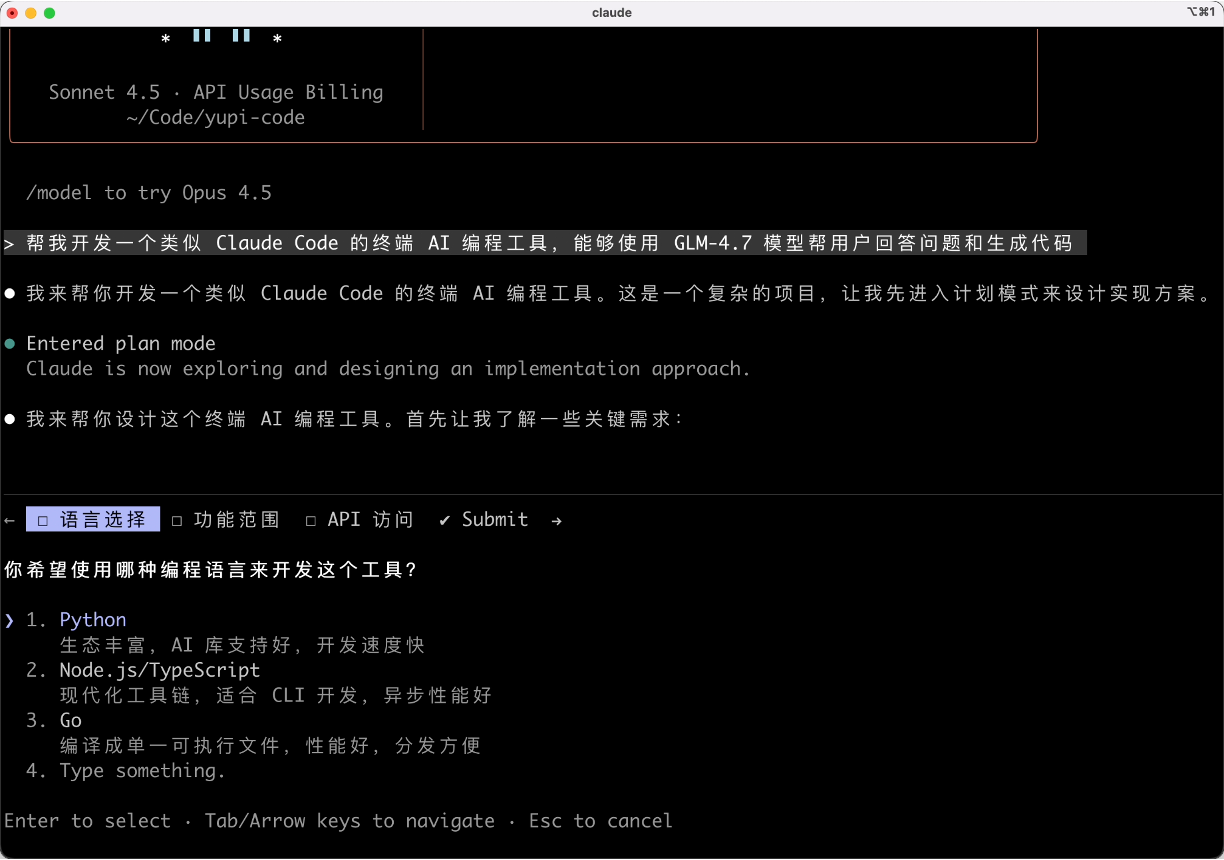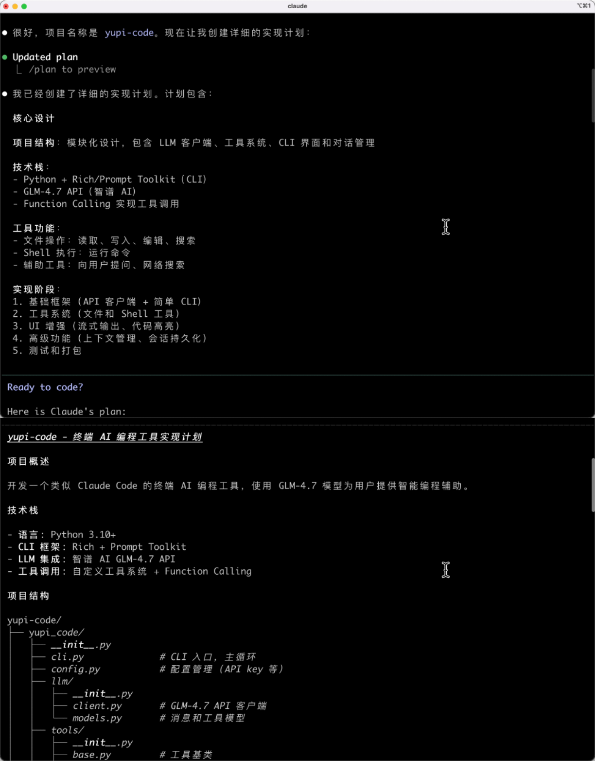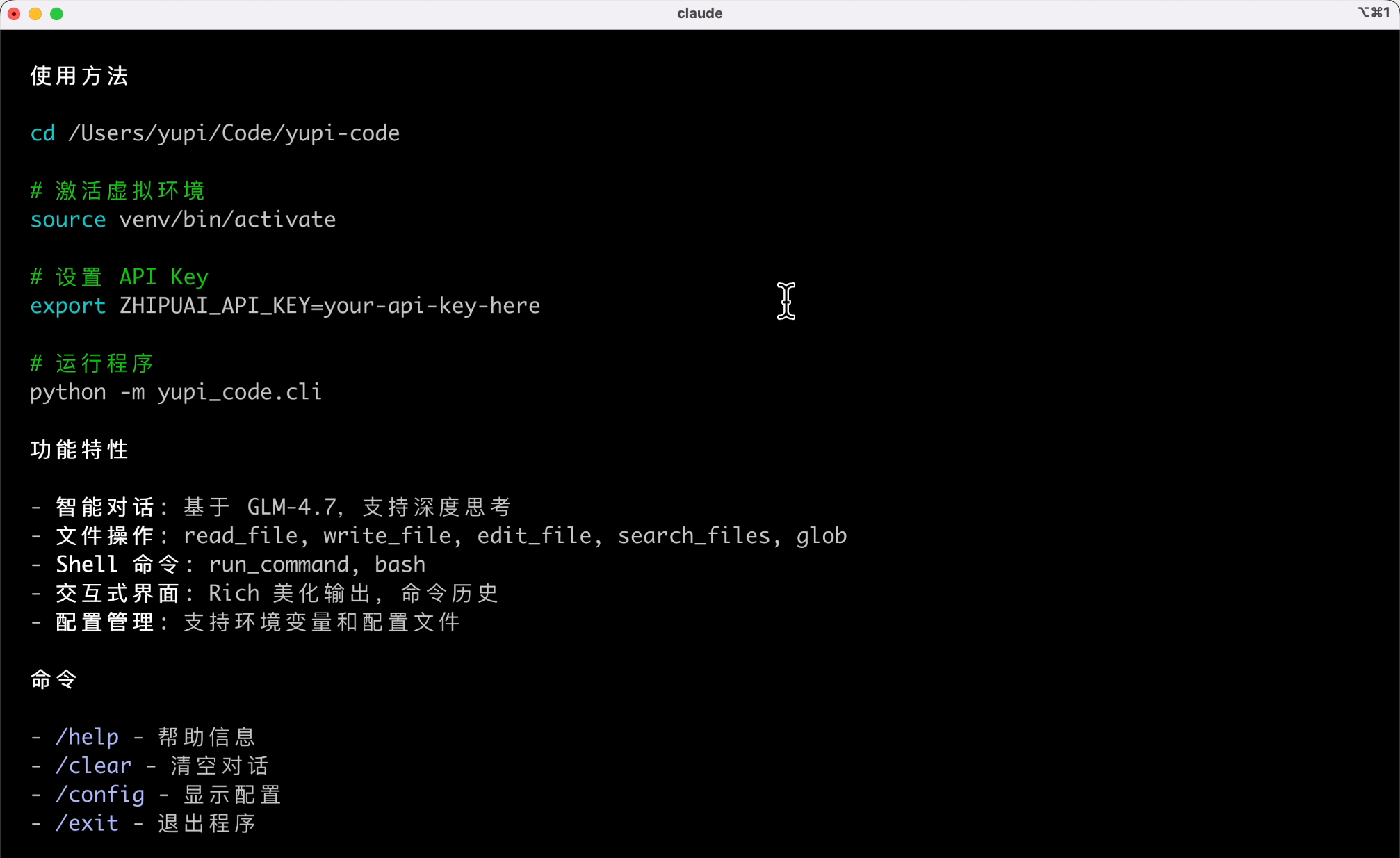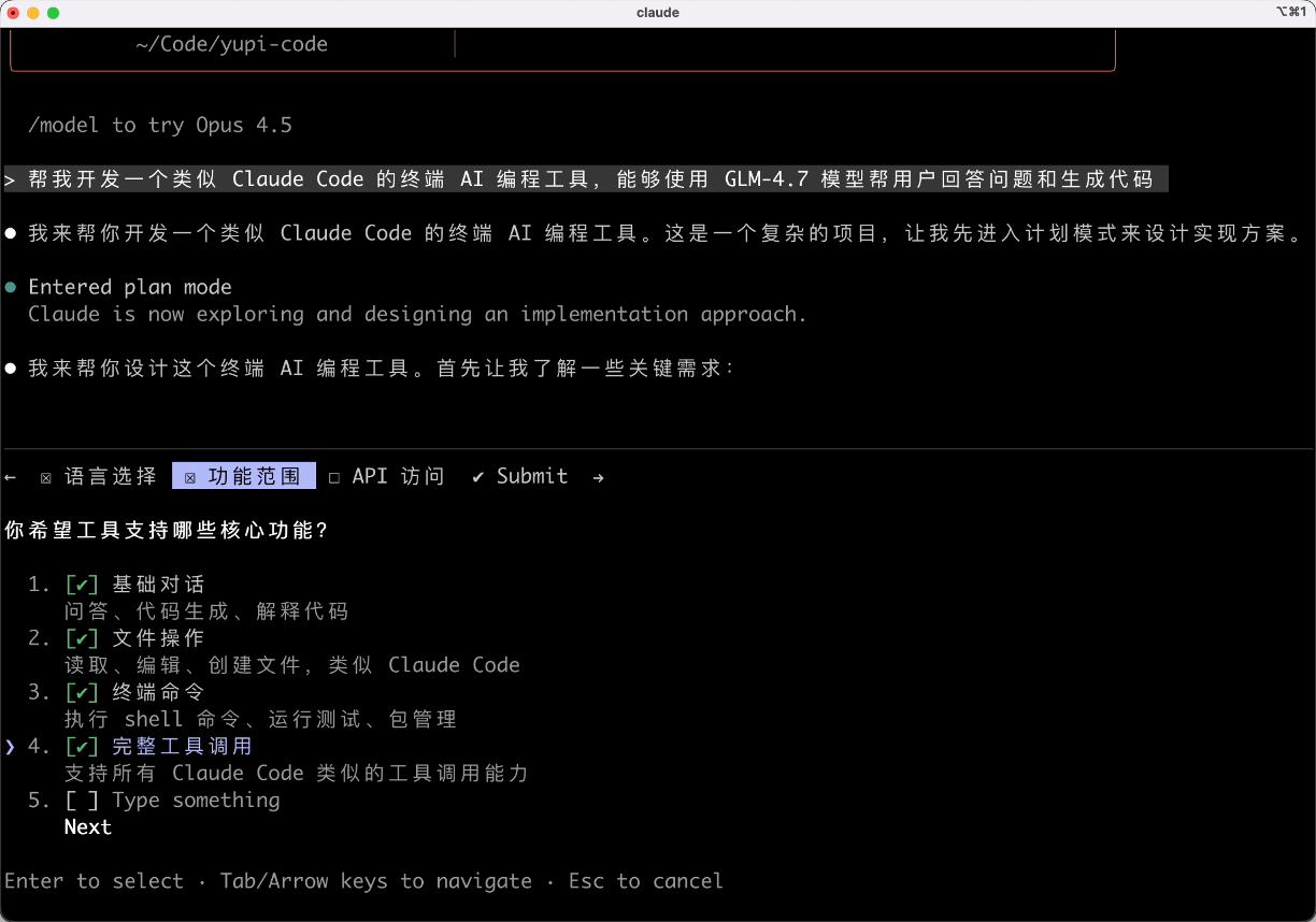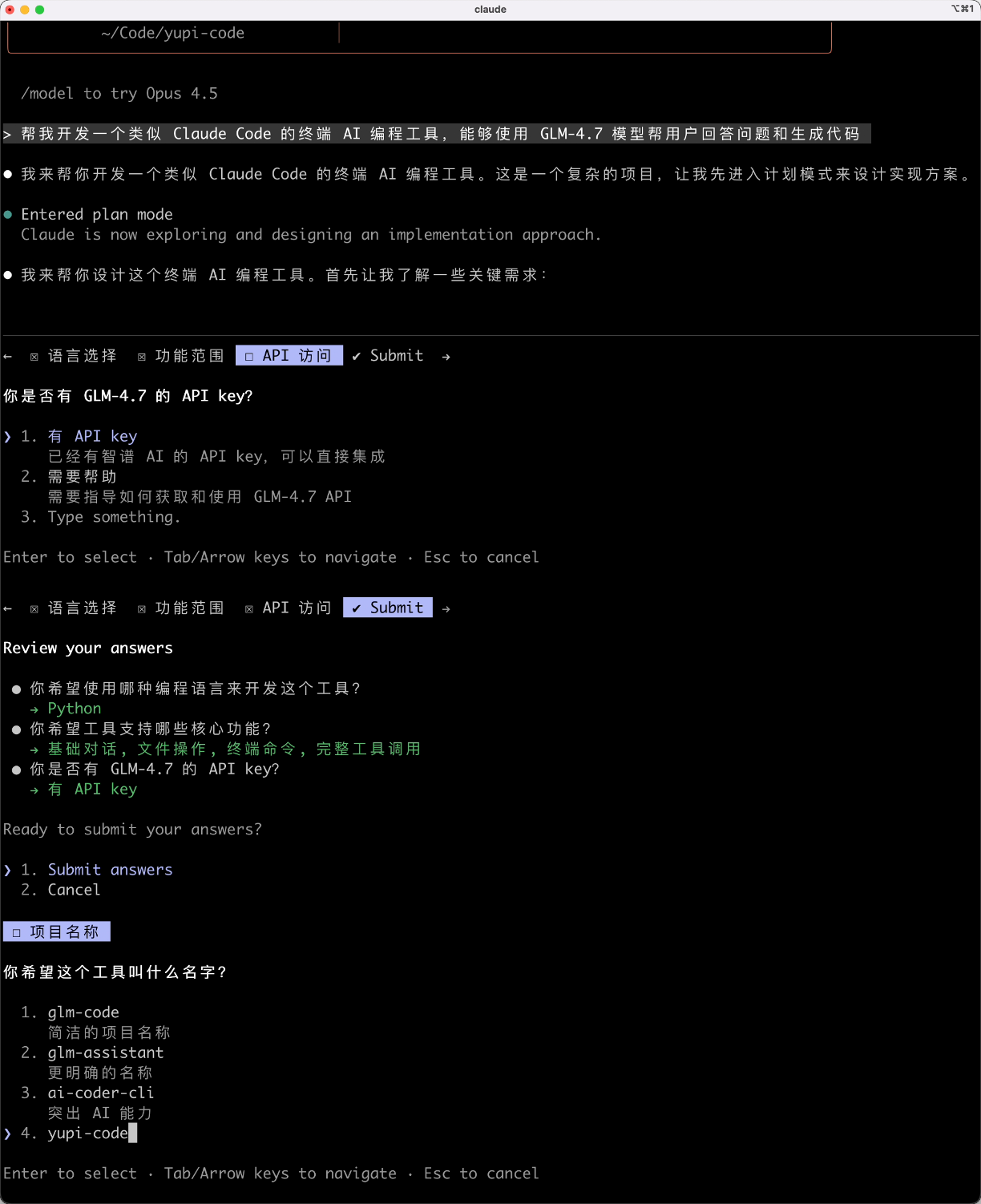 OK,这就是我 利用国产的 AI 大模型 GLM-4.7 + Claude Code 开发出一个 基于 GLM-4.7 的 Yupi Code 的全过程了。