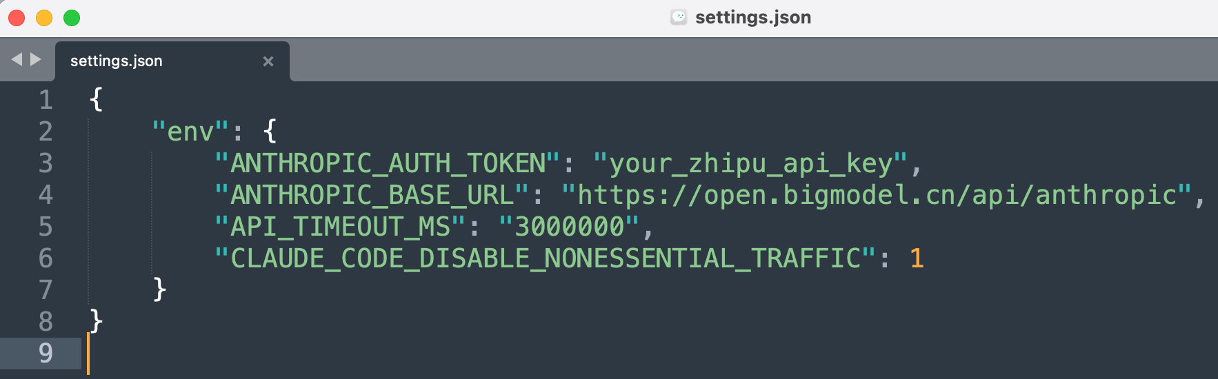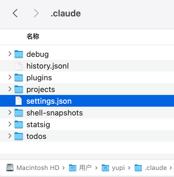 不过没关系,让我们把它背后的 AI 大模型换成国内的 GLM-4.7。首先进入 {用户目录}/.claude 目录,创建一个 settings.json 配置文件: