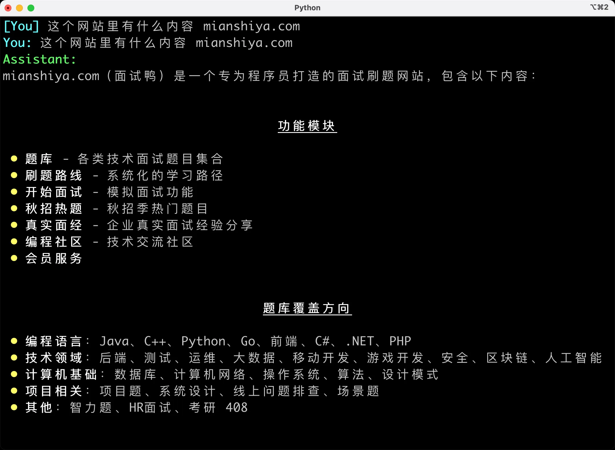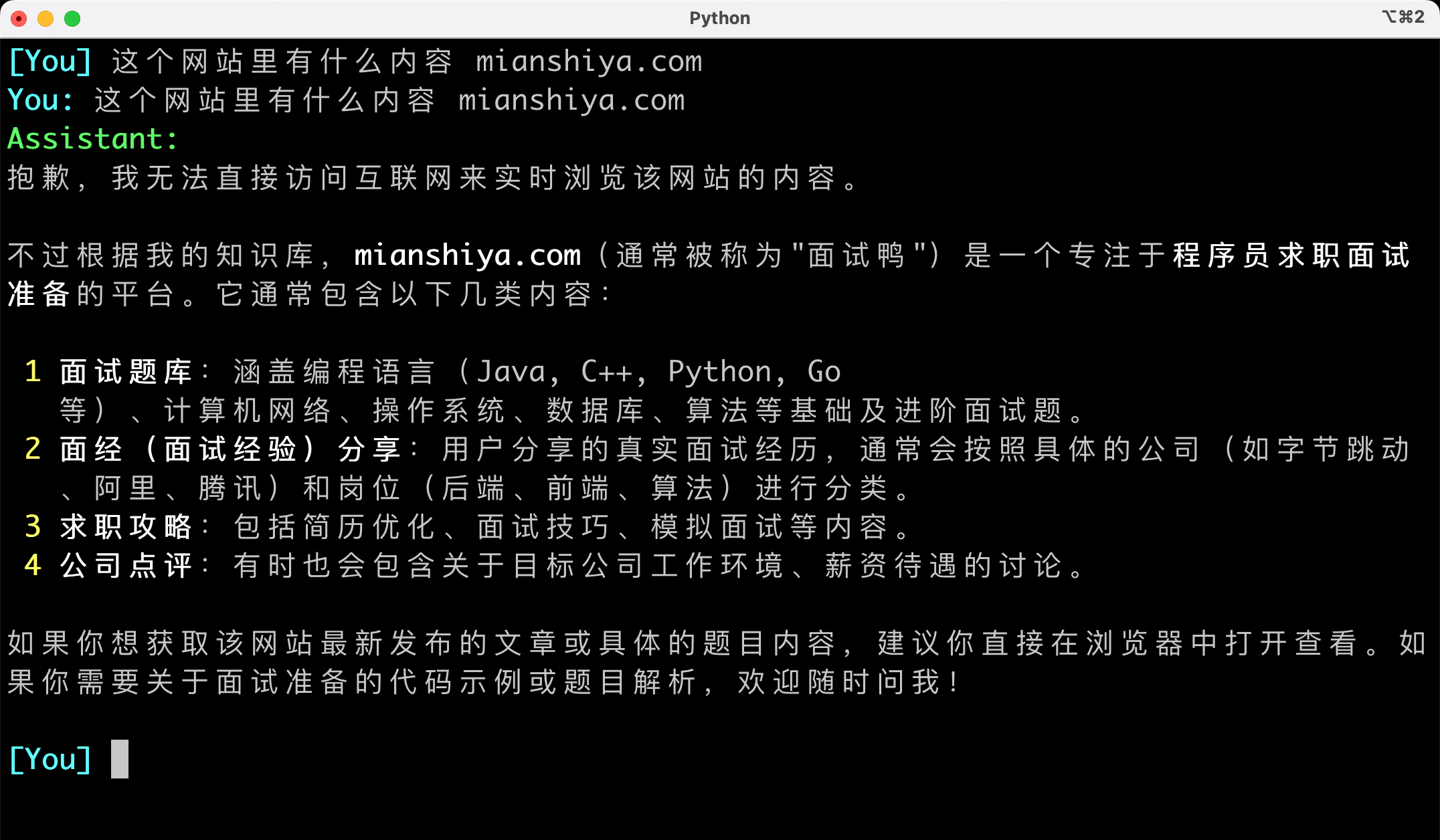 我打开一个新的终端,然后运行 yupicode 脚本,尝试和 AI 对话: