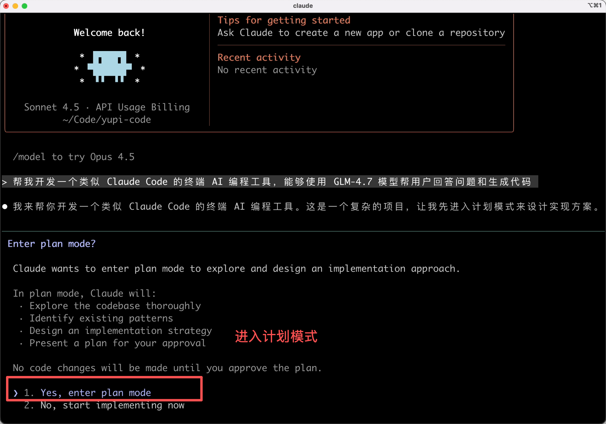 果然,AI 判断这是一个复杂的项目,想要进入 计划模式 —— 先明确需求、设计方案再开发。